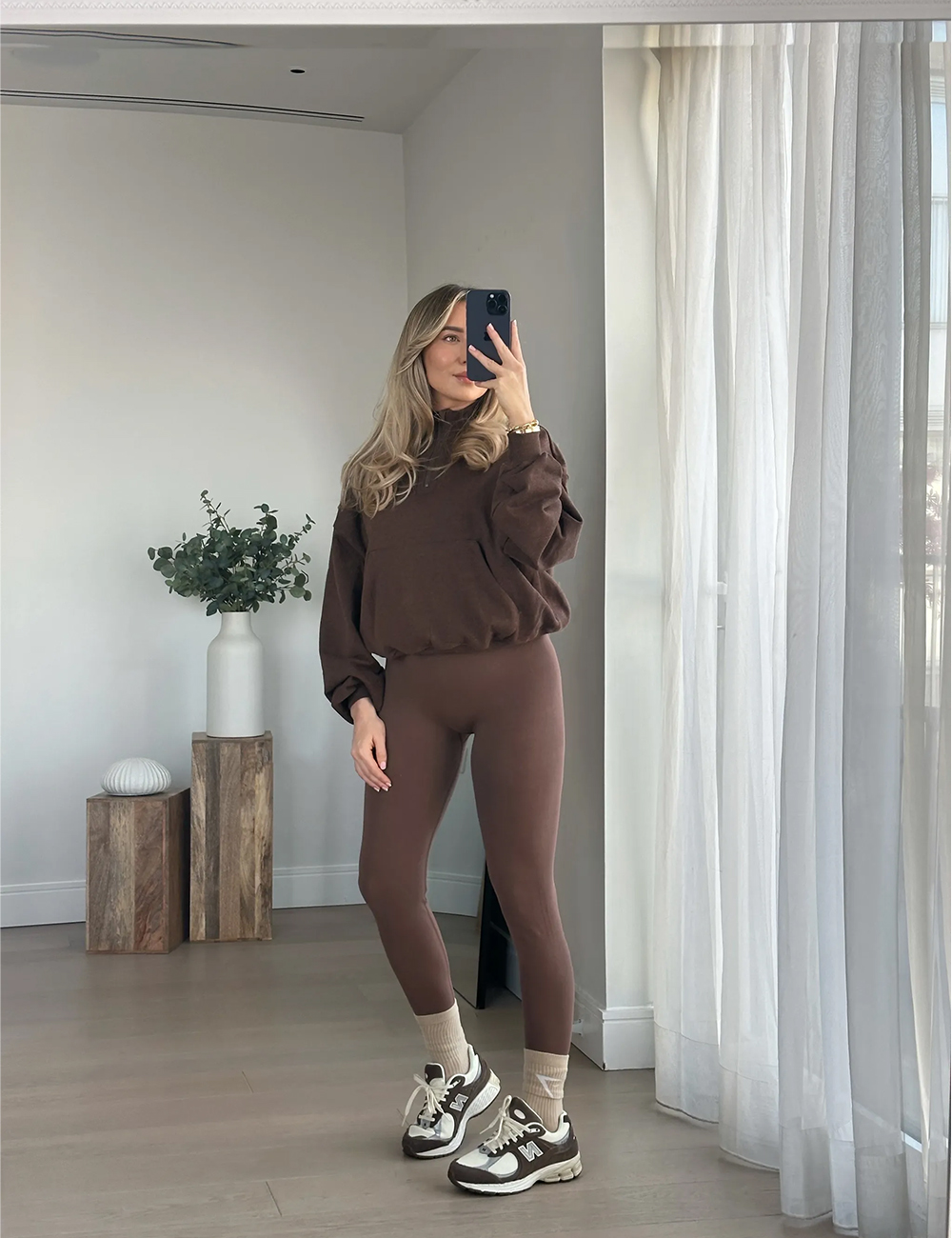 Today’s modern era of athleisurewear offers an infinite amount of outfit options; a lot of them with a trusty pair of leggings at their foundation. In 2025, everyday athleisure is refined; perfect boxy tees, thick, heavyweight hoodies tucked into a neat crop, white crew socks pulled over leggings, chunky sneakers and a pair of sunnies – the look never misses. For something a little more form-fitting but still yet relaxed, a monochrome matching set of leggings and a fitted jacket is a sleek ensemble for everything from a grocery run to a late-night flight.