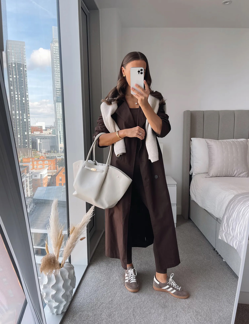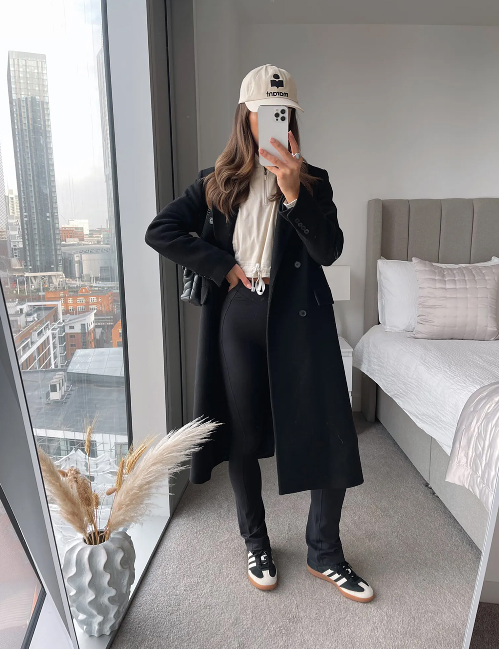 We all love the ritualistic rush of a weekend filled with little plans; a scenic morning walk, heading to your favorite bakery / coffee spot, and finishing at a local market. For these occasions, it’s nice to play dress-up, but still stay casual and comfy. This is where the high-quality items in our wardrobe like cashmere sweaters, heavyweight zip-hoodies and long wool coats will elevate everyday leggings outfits with a stylish touch. Throw on your chunky zip hoodie, fav pair of black leggings, and long trench coat; finish with a pair of chunky socks and trendy walking trainers and that’s your weekend uniform sorted.