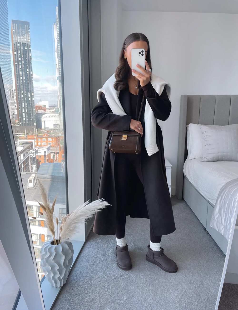 For running errands or grabbing coffee, cozy-casual everyday outfits are key. You can’t go wrong with pairing high-waisted leggings with an oversized wool sweater or cropped knit cardigan for cuteness and comfort. Chunky sneakers or UGG boots complete the slipped-into style, giving you an effortlessly cool aesthetic that only takes seconds to get right. For chillier days, throw on a super-puffer or oversized trench coat to add dimension to the outfit.