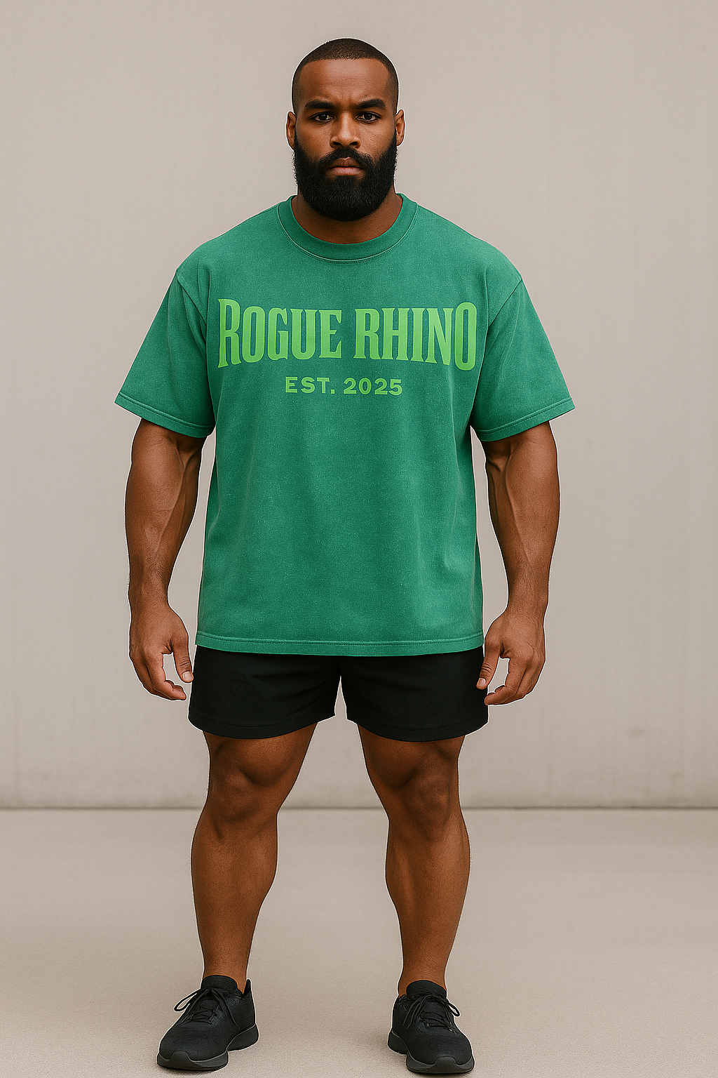 The Heavyweight Stamped Tee in Forest Green blends retro character with modern muscle. Built from thick, garment-dyed cotton and cut in an oversized silhouette, this piece delivers comfort and visual punch in equal measure. Featuring a bold “ROGUE RHINO EST. 2025” front graphic and a tonal Rogue Rhino Lifting Club crest on the back collar, it’s a statement staple for gym days or off-duty wear.